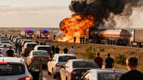 В Ростовской области на участке трассы Ростов — Таганрог произошла серьезная авария с участием бензовоза. По данным пресс-службы областного управления МВД РФ, инцидент случился на 33-м километре автодороги. После столкновения грузовой автомобиль, перевозивший топливо, загорелся. Над дорогой поднялись густые клубы черного дыма, которые были видны за несколько километров.