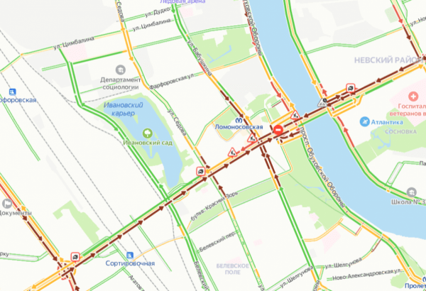 Вечером 5 октября в Невском районе наблюдается затор. Причиной этого стали дорожные работы на Ивановской улице.