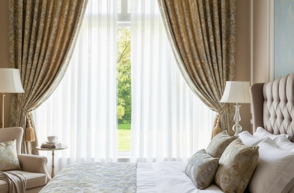 В 2026 году популярны материалы, которые не только украшают, но и создают оптимальные условия для отдыха. Среди фаворитов — лен, хлопок, вискоза, бархат, блэкаут, а также смесовые ткани. Лен отлично вписывается в разные стили, пропускает воздух и выглядит естественно, но может выцветать на солнце. Хлопок приятен на ощупь, не теряет форму и подходит для умеренно освещенных комнат. Вискоза напоминает шелк, но проще в уходе и красиво драпируется. Для тех, кто предпочитает полное затемнение, подойдет блэкаут — плотный материал, полностью блокирующий свет. Бархат добавляет уюта и тепла, а шелк и сатин придают интерьеру легкий блеск, хотя требуют бережного обращения. Вуаль и тюль используются для создания многослойности и легкости, а смесовые ткани сочетают износостойкость и простоту ухода.
