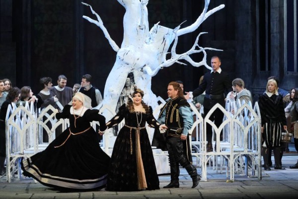 При этом вокальные работы в своем большинстве оставляют ощущение полуготовности. Певцам не всегда хватает четкой дикции, интонационной и ансамблевой точности. Но в целом титанический марафон: Михаил Петренко (Ганс Сакс), Сергей Скороходов (Вальтер), Ирина Чурилова (Ева), Ярослав Петряник (Бекмессер), Евгений Никитин (Погнер), Андрей Попов (Давид), Анна Кикнадзе (Магдалена), выдерживают достойно с доминантой комического настроения над лирическим, не говоря уж о философском. Хотя в финале режиссер все же делает попытку эффектной контекстной цитаты: белое сухое дерево, как Белое древо Гондора из саги «Властелин колец».