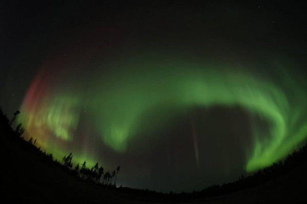 Полярное сияние этой ночью украсило небо над Ленинградской областью. Фотографам удалось заснять яркие зелёно-красные лучи, расходящиеся от огромной дуги.