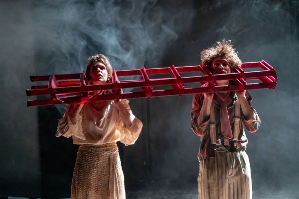 Декорации у постановки крайне скромные — небольшой белый коврик, словно отдалённый остров, пара ламп на потолке, пока что пара стульев и лестница, которая становится то окном, то кроватью, то кораблём, то всё-таки применяется по прямому назначению. Бытовая изобретательность — то, что отличает театр выпускников Спивака, и то, что всегда оказывается на руку абсурдной игре на сцене, когда зрителю особенно важно подключать воображение, любопытство и надежду. Последние два пункта вступают в свои права тогда, когда герои задействуют поначалу неприметную чёрную дверь, что служит фоном для малой сцены. Она станет и доской, на которой можно рисовать несбывшиеся мечты или воспоминания из прошлой молодой жизни, и вратами в райский сад, куда Семирамида и Душенька непременно попадут за свою чистоту, наивность и долговечную любовь. Даже если эти врата на наших глазах так ни разу не откроются.