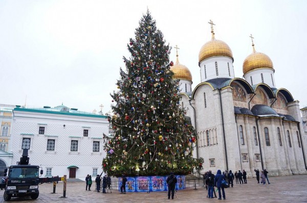 На Соборной площади нарядили главную новогоднюю ель страны. В этом году декор посвящён праздничным традициям разных регионов. Дерево окружили изображениями Дедов Морозов и Снегурочек в народных костюмах, чтобы показать сказочных персонажей со всех уголков России.