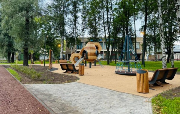 Здесь высадили новые деревья и кустарники. Установили скамейки и оборудовали две детские площадки. На них ребят ждут качели и горка. Также появилось пространство для занятий спортом. Чтобы в вечернее время в саду было комфортно, вдоль пешеходных дорожек появились фонари.